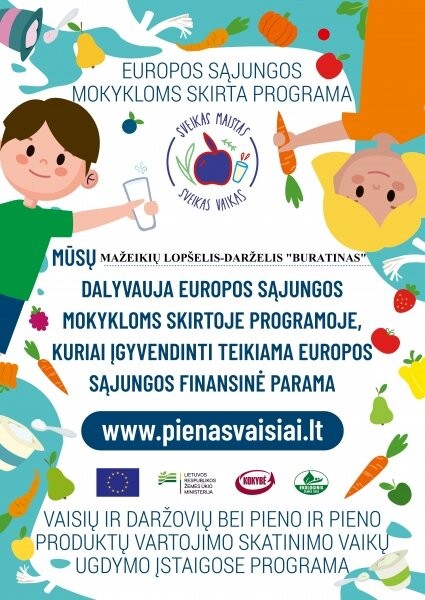 Nuo 2025 m. kovo 1 d. vykdomas projektas „Ekologiškų ir pagal nacionalinę žemės ūkio ir maisto kokybės sistemą pagamintų maisto produktų vartojimo skatinimo ikimokyklinio ugdymo įstaigose parama“.