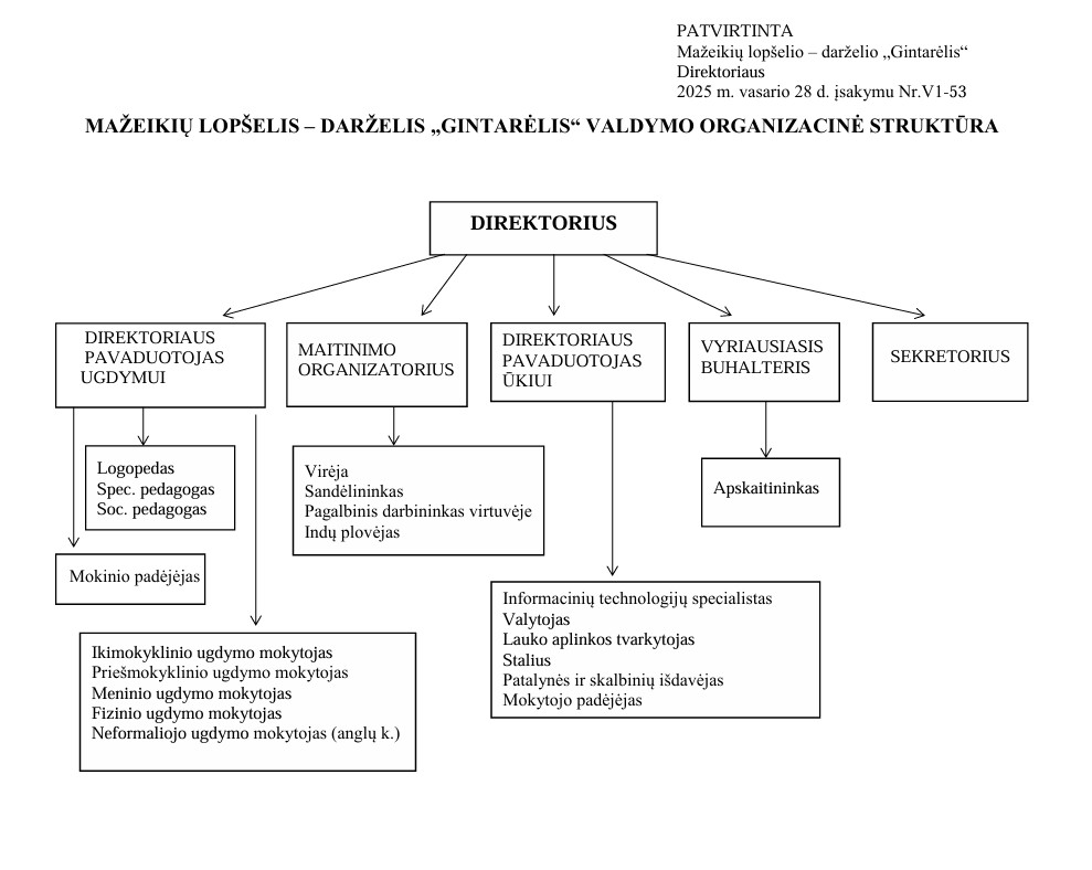 Mažeikių lopšelio-darželio „Gintarėlis” valdymo struktūra patvirtinta 2025 m. vasario 28 d. direktoriaus įsalymu Nr. V1-53